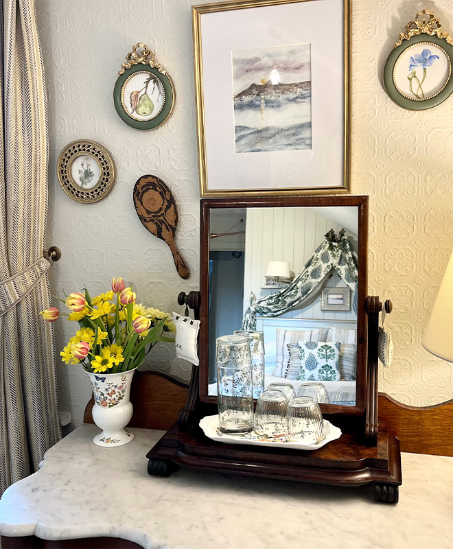 Our Premium Double Room with Sea Views. This bright and cheery room, once the home of the cottage’s original resident, features a hand-painted queen size bed, original artwork, period furniture original to the cottage (which has been in the Corr Family since it was built in 1921) and sumptuous linens and bathroom products. Harry’s Room also boasts stunning sea views across the Irish Sea, Dublin Bay, Dublin City, the Howth Peninsula, and the Wicklow Mountains.